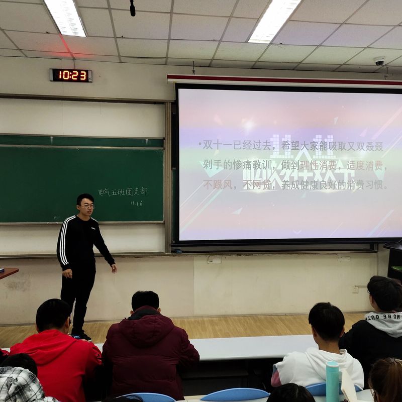2019年11月16日上午,为帮助学生树立正确的消费观,培养理性购物的意识,电气1905班在西环205教室举办以“理性看待双十一,树立正确消费观”为主题的团日活动。本次活动由心理委员戴鹏程主持,电气1905班全体学生参加。