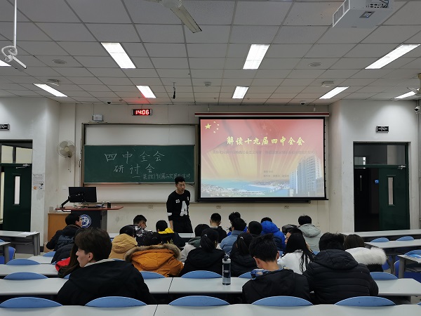 活动伊始,班长赵俣名向学生们介绍党的十九届四中全会的主要议程、开展背景及开展意义,并组织学生们对党的四中全会开展的意义与作用进行讨论与总结,发表各自的看法,让学生们深入的了解党的十九届四中全会的精神。接着,组织委员邹英培向学生们介绍了四中全会最重要的成果,“党的四中全会全面回答了‘在我国国家制度和国家治理上,应该坚持和巩固什么、完善和发展什么’这个重大政治问题”。最后,由团支书李君婵发表对本次活动的总结“经过了本次党的四中全会研讨会,我相信同学们一定了解了到了中国特色社会主义制度和国家治理体系的显著优势,为自己生活在这样一个强大的国家感到自豪,也更加坚定了要为这个日益强大的国家努力奋斗的决心。”