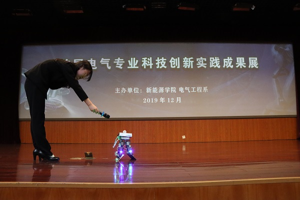 本次展示会分为两个部分进行展开。首先,此次展示会采取“创新达人秀”的模式,由各参赛队伍依次进行科技创新实践成果答辩及进行成果展示。答辩限时四分钟,各参赛队伍答辩人通过对团队成员介绍,作品设计背景、设计原理、功能演示等方面进行成果展示。随后,比赛评委与大众评审参考各参赛作品的综合表现,对各参赛队伍依次打分,对获奖作品进行颁奖并合影留念。此次比赛由来自电气专业的四十八队伍参加,基于《微特电机》课程设计,制作出基于微特电机原理的比赛作品并参与答辩,比赛综合专业评委打分与在场参赛选手打分,最终决出一等奖一组,二等奖两组,三等奖三组。此外,本次展示会另设抽奖环节,由郭杰等三个嘉宾依次抽取标记球,抽选一名学生获得精美礼品一份。董磊在谈到此次展示会的意义时讲到:“此次展示会展现了电气学子的风采,无论从答辩人的仪容仪表,还是参赛作品的呈现效果,都得到了老师们的肯定。”