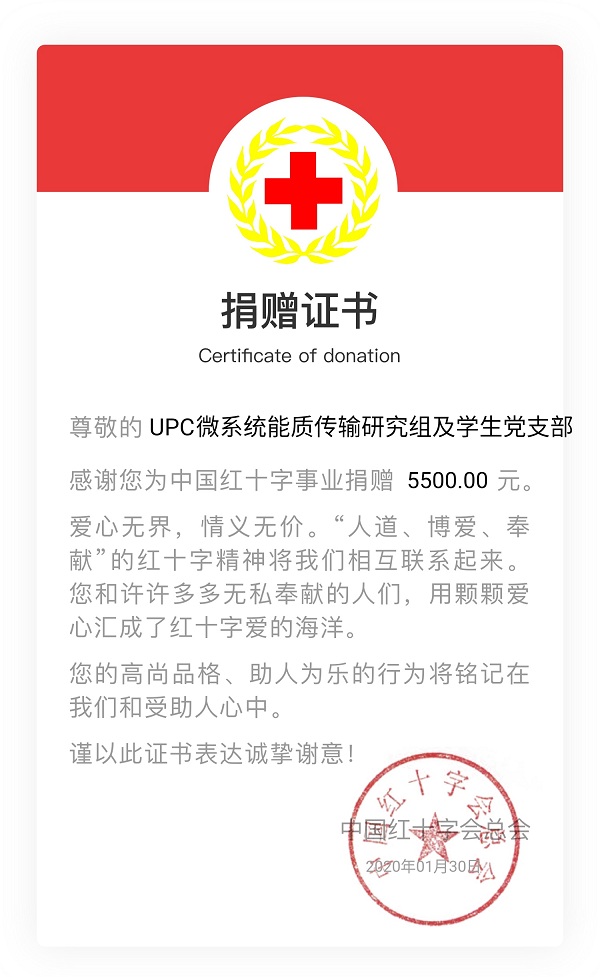 1月30日,太阳集团网站8722太阳集团城娱8722微系统能质传输研究组师生及太阳集团城娱8722能动研究生第一党支部研究生向中国红十字会捐出5500元,用于新型冠状病毒防治,并在当天收到了来自中国红十字会的捐赠证书。