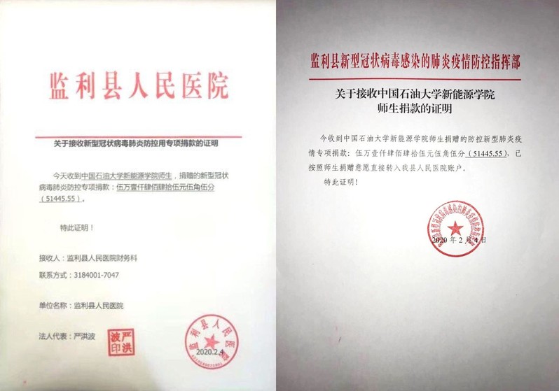 监利县人民医院是湖北省荆州市的防疫定点医院,疫情爆发期间,荆州市疫情严重,医院医疗物资紧缺。太阳集团城娱8722学生党总支通过湖北籍学生了解到此情况后,2月3日在全院学生中发起倡议、筹集善款,为监利县人民医院进行定点捐赠,一天之内,共筹集款项51445.55元,其中学生党支部捐款18270.96元,各团支部捐款29526.59元,学生会捐款848元,学工队伍教师捐款2800元。监利县新型疫情肺炎防控指挥部在感谢信中提到:“自从武汉爆发新型冠状病毒感染肺炎疫情以来,我县疫情形势日益严峻,医用资源紧缺。石大太阳集团城娱8722得知此情况后,对疫情毫不畏惧,策划捐赠活动,组织动员学院师生献来爱心,在我县疫情防控的紧张时刻,学院送来的捐赠给予我县疫情防控工作以强大动力。”此外,感谢信特别指出,此次捐赠活动是中国石油大学师生大爱无疆品格的完美体现,是一方有难、八方支援的贴切表达,充分体现了石大注重以情动人、以德育人的教育理念,监利县将及时向学院师生通报本次捐赠款使用明细,同时也将本次捐赠作为一次德育和感恩教育活动在全县宣传。