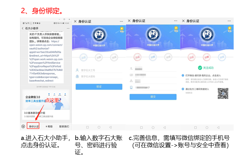 1.关于身份绑定:关注太阳集团网站8722微信企业号后需进行身份绑定。如已经绑定请核查绑定信息是否正确,若非当前正确信息,进入公众号,搜索石大小助手,从下方的身份验证栏进入个人中心,解绑微信号并退出登录,重新进行正确身份验证。