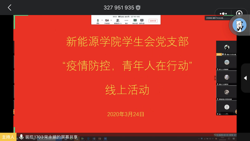 活动伊始,宋永娟首先介绍了活动背景、流程及内容,随后,支部成员观看了《中国抗疫的世界意义》视频并学习习近平总书记给北京大学援鄂医疗队全体90后党员的回信,由此展开积讨,同时分享抗疫故事。支部成员韩玉杰谈到,在疫情中,中国举全国之力迅速封城,采取一系列防控措施,支部成员宋凯亮分享说,青年应当在国家有难的时候勇敢的站出来,我们应当向抗疫英雄学习,为国家做出自己的一份贡献。宋永娟补充,如果有一天真正需要我们的时候,我们应当毫不犹豫的冲出去,守护我们的国家。最后,团委书记穆海涛做出总结,疫情管控短时间取得如此大的成就的原因主要还是制度优势;其次,疫情期间,要有学习也要有实践,当问题来临时,我们不光要学习90后援颚医疗队的品质,也要有敢于冲锋在前的决心,更要在日常生活中注重考验自身的韧性和耐性,平时要做好党员的先锋模范作用,在疫情实践中学习提升自我。