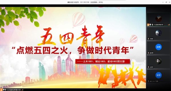 为进一步学习习近平总书记对青年一代的青春寄语,能源与动力工程1802团支部联合土木工程1801团支部和油气储运工程1803团支部于5月21日开展“点燃五四之火,争做时代青年”线上主题团日活动。本次活动由土木1801团支部书记马芃晟主持,三个支部全体成员共同参加。