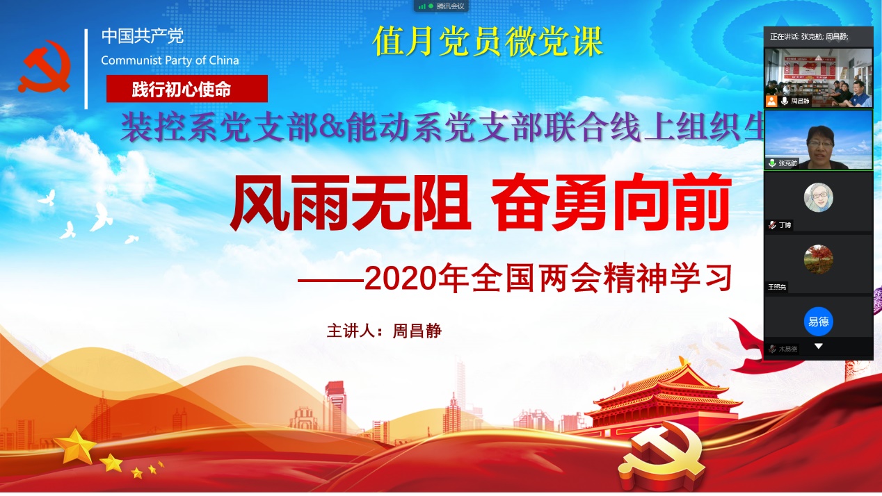 2020年6月24日,装控系党支部和能动系党支部联合开展了线上组织生活,会议由装控系支部书记左海强和能动系支部书记张克舫同志共同主持。左海强书记首先介绍了装控系开展的值月党员制度,之后由装控系本月值月党员周昌静同志主讲以 “风雨无阻,奋勇向前-2020年全国两会精神学习”为题的微党课。装控系和能动系全体党员参加了会议。装控系部分党员在工科楼E411党员之家现场参加了会议。