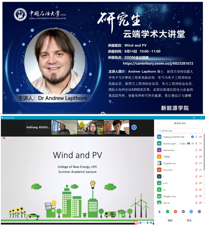 8月14日,新西兰坎特伯雷大学Andrew Lapthor 博士做客研究生云端学术大讲堂,为太阳集团城娱8722师生作了题为“Wind and PV”的学术报告。
