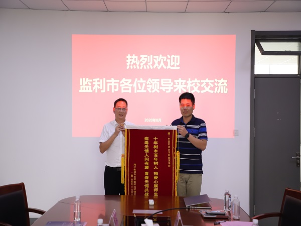 双方同时还就优秀生源基地的建立、学生录取情况、日常健康卫生防护等工作进行了深入的讨论。期间,游袤副市长代表监利市防控指挥部向学院赠送锦旗;孔双红代表监利市人民医院向学院学生党总支赠送锦旗。会后,游袤一行参观了校史陈列馆。