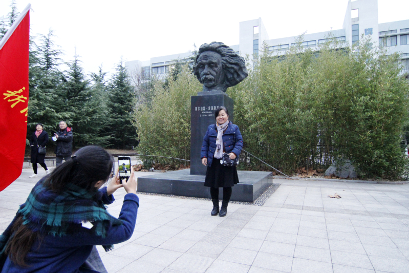 爱因斯坦铜像、孙建初塑像、杨光华老校长塑像、小黄山、地球仪广场、创造太阳雕塑、“荟萃”浮雕、“蕴”雕塑……从新图书馆东馆出发,教职工们的脚步覆盖学校大部分景观。