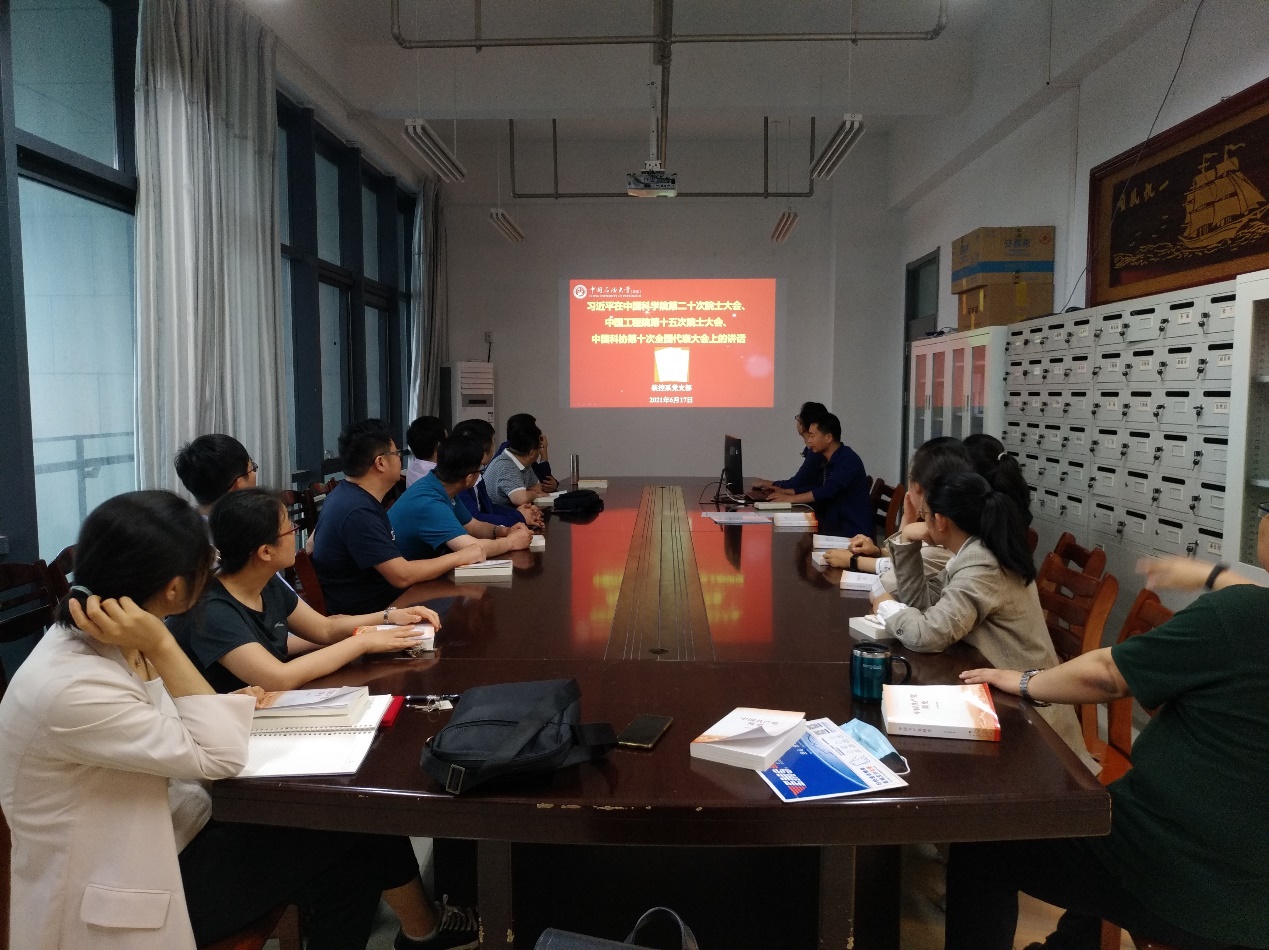 之后,支部共同学习了“习近平在中国科学院第二十次院士大会、中国工程院第十五次院士大会、中国科协第十次全国代表大会上的讲话”。在革命、建设、改革各个历史时期,我们党都高度重视科技事业。从革命时期高度重视知识分子工作,到新中国成立后吹响“向科学进军”的号角,到改革开放提出“科学技术是第一生产力”的论断;从进入新世纪深入实施知识创新工程、科教兴国战略、人才强国战略,不断完善国家创新体系、建设创新型国家,到党的十八大后提出创新是第一动力、全面实施创新驱动发展战略、建设世界科技强国,科技事业在党和人民事业中始终具有十分重要的战略地位、发挥了十分重要的战略作用。近年来,在党中央坚强领导下,在全国科技界和社会各界共同努力下,我国科技实力正在从量的积累迈向质的飞跃、从点的突破迈向系统能力提升,科技创新取得新的历史性成就。