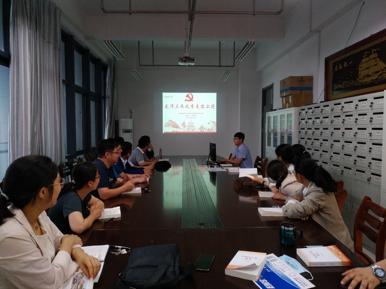 随后是“党史小故事”分享活动,本期由张兰老师分享了“两弹一星”元勋——郭永怀”的故事。郭永怀是著名力学家、应用数学家、空气动力学家,中国科学院学部委员,近代力学事业的奠基人之一。他长期从事航空工程研究,担负了国防科学研究的业务领导工作,为发展导弹、核弹与人造卫星事业做出了重要贡献。1999年,郭永怀先生被授予“两弹一星荣誉勋章” ,是该群体中唯一一位获得“烈士”称号的科学家。张玉财老师分享了“龙潭三杰之李克农上将”的故事。李克农同志是中国共产党隐蔽战线卓越领导者和组织者,周恩来曾把他与钱壮飞、胡底并列为党的情报工作"龙潭三杰",是唯一没有打过仗的开国上将。