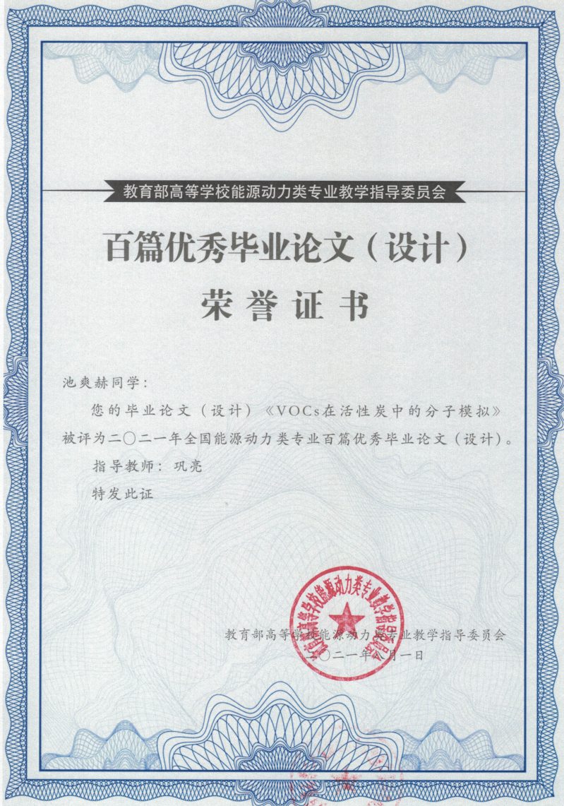 8月28日,教育部高等学校能源动力类专业教学指导委员会主办的首届(2021年)全国能源动力类专业优秀本科毕业论文(设计)展示交流活动在山东大学落下帷幕。我院能动1702班池爽赫同学的毕业论文《VOCS在活性炭中的分子模拟》被评为全国能源动力类专业百篇优秀毕业论文(设计),论文指导教师为巩亮教授。
