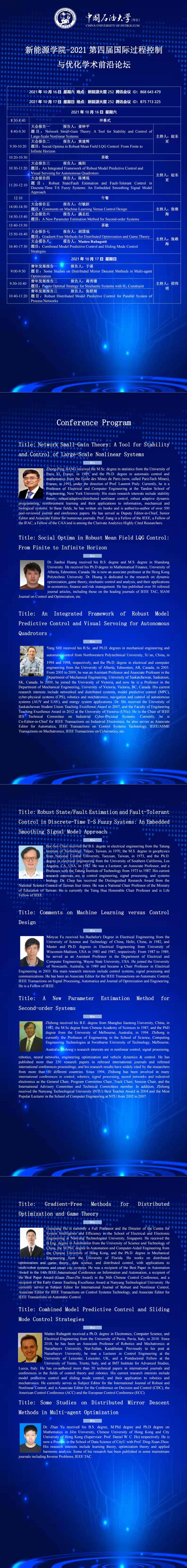 为加强控制与优化理论与应用方面的交流和讨论,促进我国在该领域的人才培养和快速发展,由我院承办的第四届国际过程控制与优化学术前沿论坛定于2021年10月16日至10月17日在古镇口校区新能源大厦252召开,我院赵东亚教授、刘国荣教授、山东科技大学张维海教授担任本次会议主席。