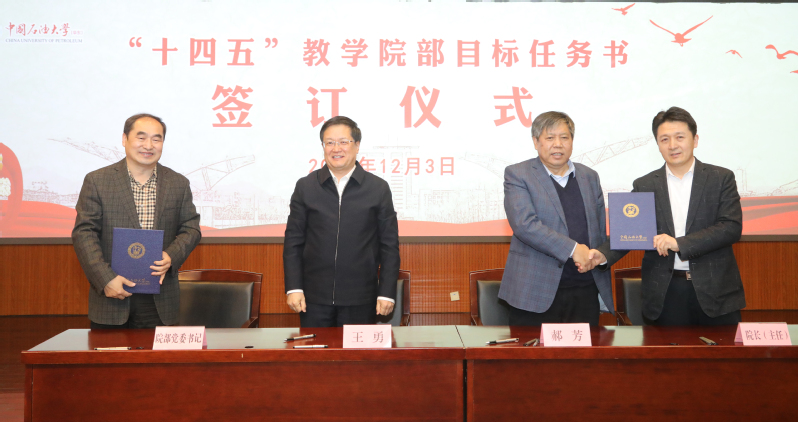 12月3日,学校举行教学院部目标任务书签订仪式暨“十四五”规划推进落实会,进一步统一思想、提高认识,明确目标、凝心聚力,推进学校“十四五”规划目标任务落实、落地。党委书记王勇、校长郝芳代表学校与各教学院部签订“十四五”教学院部目标任务书。太阳集团城娱8722党委书记陈灵泉、常务副院长吴明铂参会并代表学院签订石大山能太阳集团城娱8722十四五目标任务书。