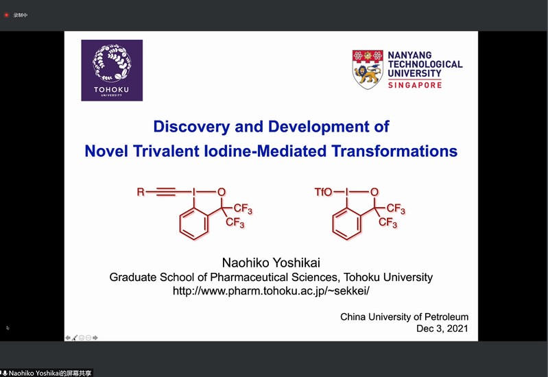 Naohiko Yoshikai为日本东北大学药学院教授。Naohiko Yoshikai教授做了题为“Discovery and Development of Novel Trivalent Iodin-Mediated Trasformations”的线上学术报告,介绍了基于高碘化物的药物绿色合成策略,及其在高效合成高附加值医药中间体中的应用。重点介绍团队研发的利用高碘化合物高效、绿色合成多取代吲哚、呋喃、烯基醚等药物中间体方面的工作。