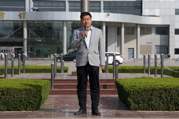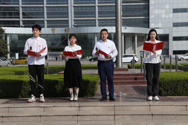 “响应时代号召,续棒民族复兴!”在王鹏翔,学生代表田鸽、李维凯、杨子钰的领诵下,百名学生齐诵“一心向党,奔赴远方”致献词,深切表达了青年学子们的拳拳爱国情,铮铮强国心。