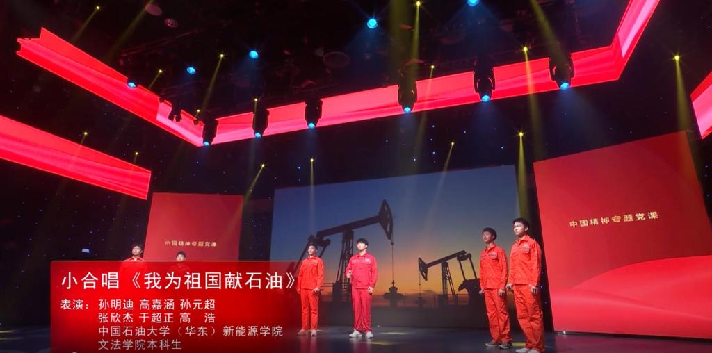 专题党课根据中国精神谱系的历史分期,选取了延安精神、沂蒙精神、大庆(铁人)精神、改革开放精神、科学家精神、抗疫精神、伟大建党精神等 体现时代特点、山东本土特色、西海岸新区发展特色、石油大学行业特色的中国精神,以《延安颂》《沂蒙山小调》《我为祖国献石油》《春天的故事》《祖国不会忘记》《不忘初心》等体现相关精神历史背景的歌曲为串联,邀请校内外各行各业代表对精神内涵进行讲解,引导广大学生在历史的旋律中重温伟大中国精神的磅礴力量。