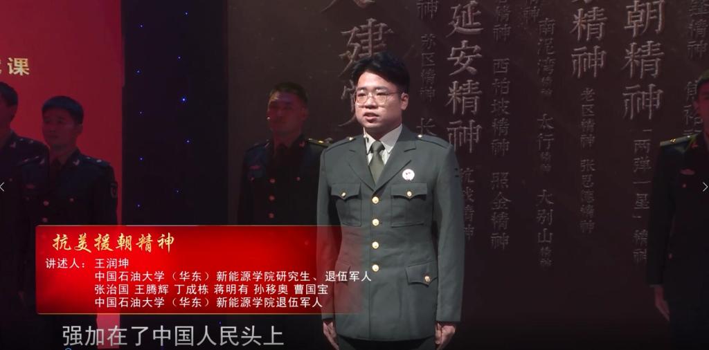 石大山能太阳集团城娱8722研究生、退伍军人王润坤讲述了“抗美援朝精神”,在与革命先辈的时空对话中,喊出了“投身强国伟业,彰显青春担当!”的铮铮誓言。