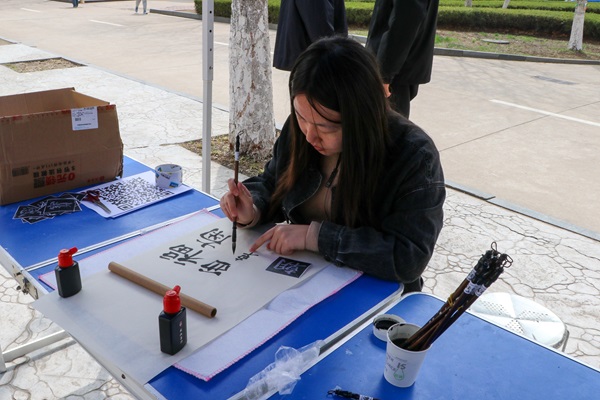 本次活动为参与活动的学生准备了笔墨宣纸,鼓励大家积极参加,书写汉字。活动伊始,志愿者率先示范,引领各位参与者书写汉字,鼓励学生挥洒笔墨,大胆书写。志愿者耐心指导学生如何握笔,如何书写。随着参加人数的增多,大家自由发挥,挥洒墨韵,用手中苍劲的毛笔赋予宣纸新的生命力。志愿者将学生写好的作品挂在摊位上,以此来展示他们的对书法的爱好,同时也吸引来了一批想要体验书法,感受汉字魅力的学生。参与者段学良表示:“这次书法体验活动非常有趣,学长学姐们都很有耐心的教我们怎么书写,让我真实体验到了书法的乐趣,希望以后还能参加相关活动。”