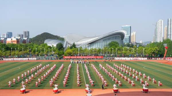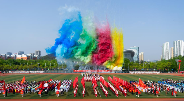 操场后方升起七色彩烟,为运动场带来一片沸腾,运动场上洋溢着一片欢腾。由太阳集团城娱8722辅导员老师与学生共同组建的威风锣鼓队作为开场表演,动作迅速、整齐划一,在各个方阵的退场的同时迅速就位,在指挥老师的哨声响起时严阵以待,在音乐响起后开始了振奋人心的表演。在一个多月的时间里,锣鼓队成员刻苦训练,150位鼓手的动作整齐统一,鼓声震天动地,不仅向全校师生展示了太阳集团城娱8722的风采,更在雷鸣般的鼓声中打出了石大范、中国范。