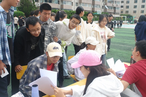 首先,各班班主任将学生们带至操场并分发明信片。学生们凭此参加活动并收集印章,集章则可以至兑奖处兑换奖品。奖品包含在校举办活动时,收集到的来自不同地域的爱心人士捐赠的玩偶,以及文具和小摆件等。闯关游戏以各类课程的知识点为基础,考验学生们的课堂掌握程度,帮助他们将知识牢记心中。“谁是卧底”游戏则是一种新颖的互动方式,以与各学科易混淆概念为关键词,参与者通过言语表达和逻辑推理来找出隐藏在人群中的“卧底”,这不仅考验了大家的逻辑思维能力,也增强了参与者之间的互动和沟通。在“诗词炸弹”摊位,学生们围坐一起。在老师限定的范围内,轮流背诵诗句,领会诗人的悲欢,历史的厚重。太极推手区域则需要学生们扎马步两两互推,没有移动过的一方获胜。“这项活动的设计,是为了教给同学们做事要稳扎稳打”,教授太极拳的队员张展书说。书法摊位前,队员贾馨语和赵文强挥毫泼墨,行云流水的笔触吸引了不少围观的学生。他们跃跃欲试,不少学生熟悉毛笔的握笔和运笔方法,字体大方美观,让队员们眼前一亮。成语接龙摊位前,由队员开题,学生们排成一列,轮流回答。猜灯谜的摊位热闹非凡,学生们围着灯谜大开脑洞,冥思苦想。当揭晓答案后,他们恍然大悟,欢声笑语萦绕在操场上空。