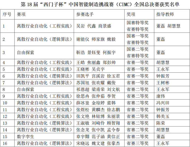 近日,第18届“西门子杯”中国智能制造挑战赛(CIMC)全国总决赛在浙江湖州顺利闭幕。我院学生代表学校参加了其中3个项目的比赛,其中,“工程实践”赛项第2年组队参赛就取得国赛特等奖,取得了学校在这一赛项上的历史性突破;“逻辑控制”赛项连续两年获得国赛一等奖,本次比赛也首次获得特等奖推荐资格;“自由探索”赛项首次参赛就斩获国赛二等奖。