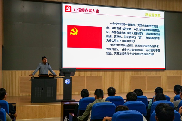 会议伊始,秦政做题为“让信仰点亮人生”的入党启蒙教育讲座。秦政引用党章,阐明党的性质、最高理想、行动指南;通过宣传片,展现中国共产党来自人民、忠诚人民、奉献人民的奋斗历程,让学生知所从来,思所将往,明知所去。秦政向学生们阐释信仰的内涵,要求学生自问入党动机是否纯洁。随后,秦政为学生指导如何写好入党申请书,以及如何在大学生活中做好自身修为。