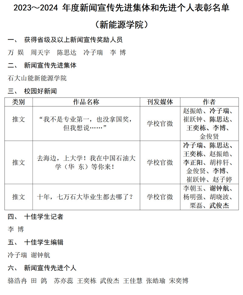 本年度,学院获评“新闻宣传先进集体”,万娱、周天宇、陈思达、冷子瑞、李博等5人被授予省级及以上新闻宣传奖励,李博被授予“十佳学生记者”荣誉称号,冷子瑞、谢钟航被授予“十佳学生编辑”荣誉称号,骆浩冉、田鸽、苏亦蕊、王奕栋、武俊杰、王佳慧、张皓瑜、宋奕博等8人获“新闻宣传先进个人”荣誉称号,王延波、骆浩冉、秦政获聘学校党委宣传部2023~2024年度特聘记者,此外由多名学生参与的三篇推文获评“校园好新闻”。