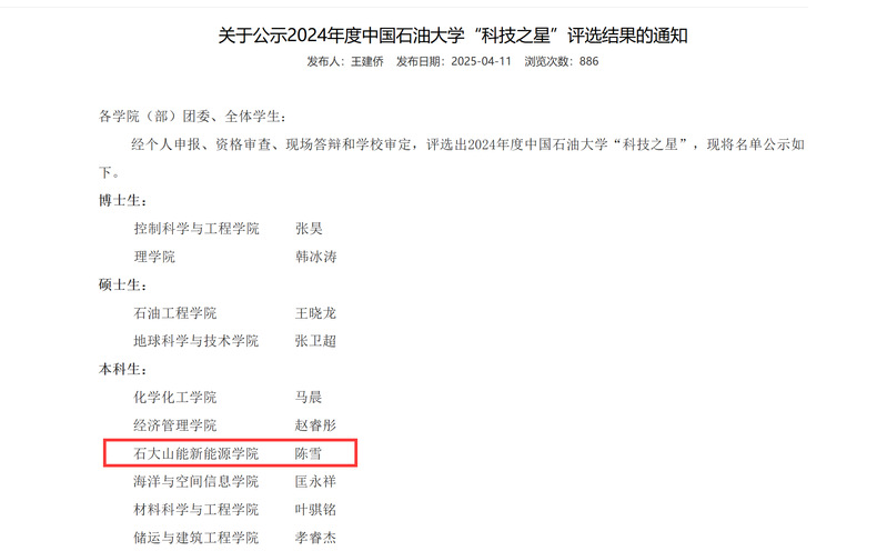 近日,2024年度中国石油大学“科技之星”评选结果揭晓,我院储能2201班陈雪获评“科技之星”荣誉称号。