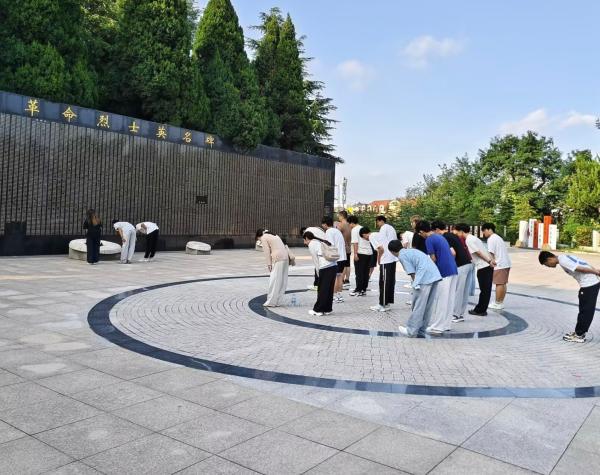 参观接近尾声,全体成员再次汇聚到革命烈士雕像前,三名学生代表手捧精心准备的花束,迈着沉稳的步伐走向雕像,将花束轻轻放置在基座两侧;全体人员脱帽肃立,默哀一分钟,现场静得只能听见微风声,每一位同学都在静默中缅怀先烈、感悟初心,让红色记忆深深烙印在心中。献花同学马伊莉感慨:“亲手把花放在雕像前时,看着花瓣轻贴基座,再想起参观时看到的先烈事迹,突然懂了今天的生活多来之不易,以后会更珍惜当下、努力向上。”学委曹芮恺则表示:“从合影时的敬意,到展馆里被先烈的旧物打动,再到见证献花的肃穆,让我明白‘铭记’不是形式。作为学委,我会把这份触动传递给更多同学,让英烈精神扎根心底。”