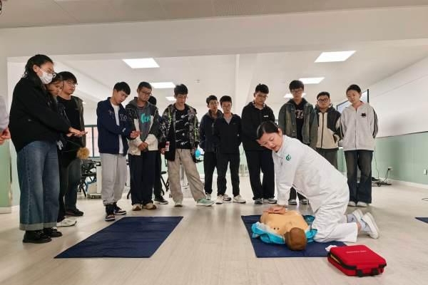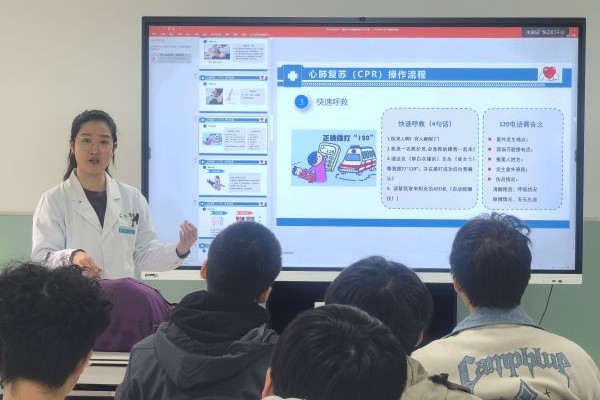 培训期间,医护人员提到,心脑血管疾病已经成为影响人类健康的头号杀手,需提高心源性猝死时的救治能力,抓住挽救生命的“黄金四分钟”。医护人员系统讲解了心脏骤停的原因、类型和表现,并且借助人体模型形象地演示了从现场评估、判断反应、快速呼救,到胸外按压、开放气道、人工呼吸的心肺复苏完整流程,说明了心肺复苏的成功指标与终止条件。随后,医护人员从功能、分类上介绍了自动体外除颤仪以及其使用方法和注意事项。在讲解海姆立克急救法时,医护人员用“肚脐眼上方,剪刀石头布”这一口诀,让同学们迅速掌握了其关键动作要领。