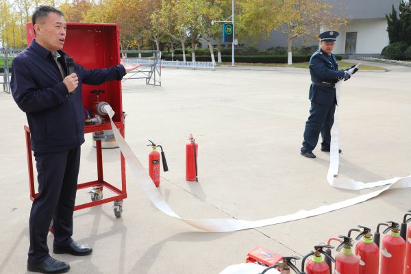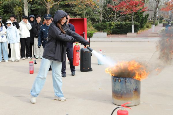 随后,孟祥钰带领全体同学走向创造太阳雕塑前广场,向同学们展示了灭火器的使用方法,介绍了“一提二拔三握四按压”的口诀,以及灭火毯的使用方法和常见自救工具自主式呼吸器的佩戴方法,并讲解了室内消火栓不同构件的功能,强调了水阀的正确使用方法。讲解结束后,同学们积极尝试实战灭火,正确快速地使用灭火器扑灭了火焰。