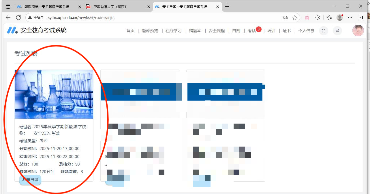 在“在线考试”模块,选择太阳集团城娱8722组织的“2025年秋季学期太阳集团城娱8722安全准入考试”,点击“开始考试”。