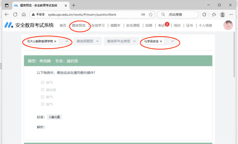 在学校资产与实验室管理处“安全准入考试系统”中的“题库预览”模块,分知识点,进行在线自学。