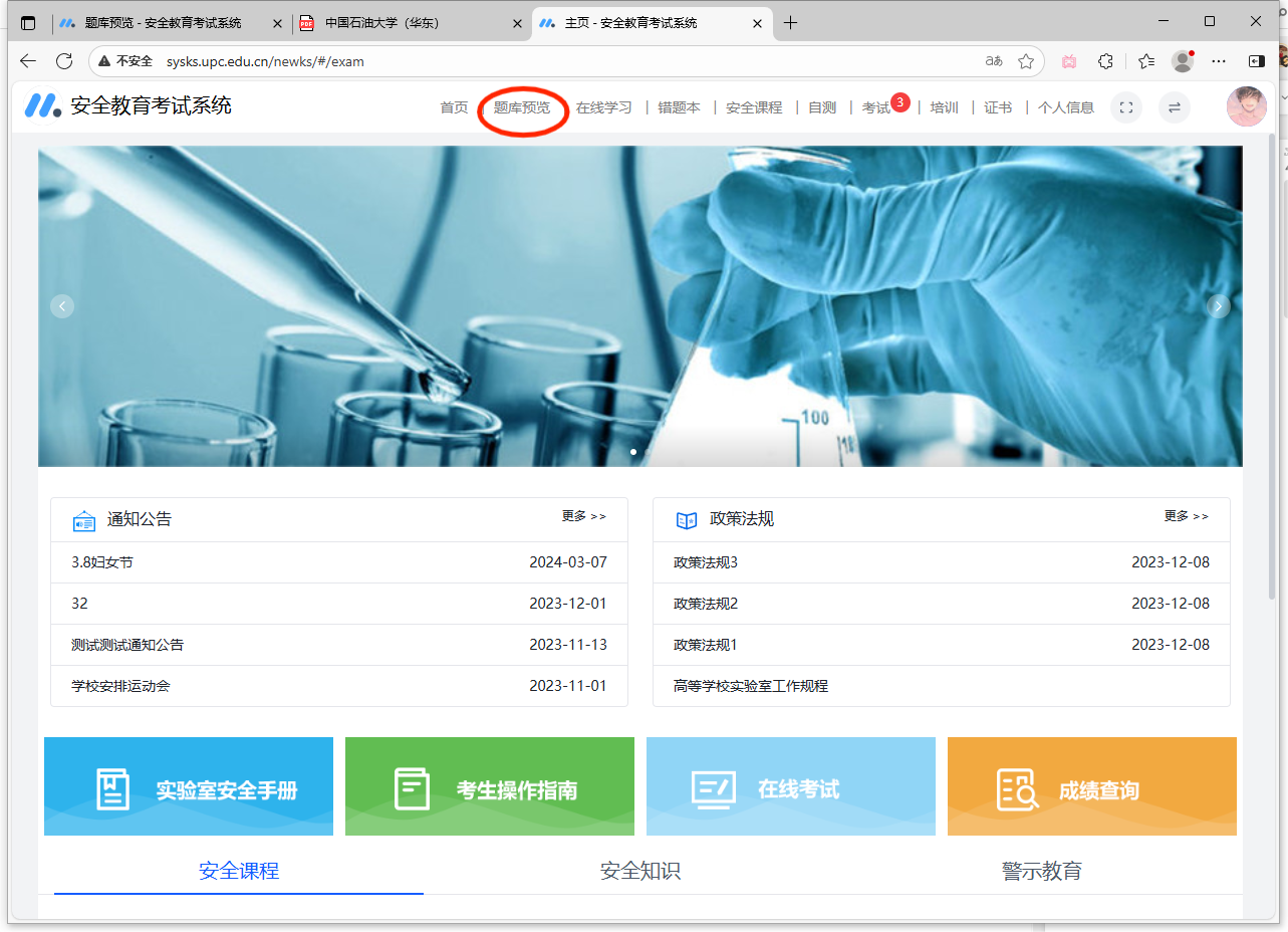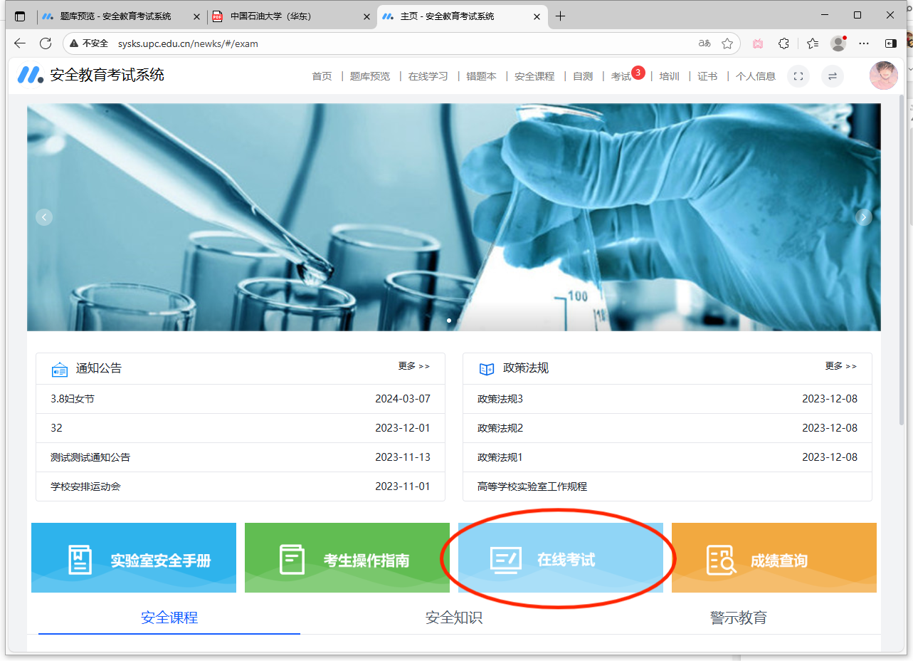 方法一:进入学校官网-机构设置-资产实验室管理处(https://gzc.upc.edu.cn/),点击进入“安全准入考试系统”,使用个人数字石大的账户登录;