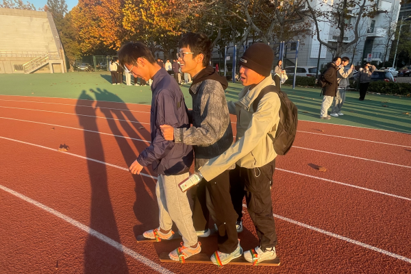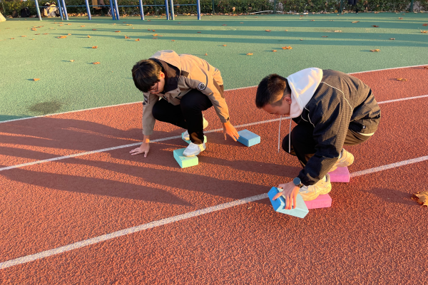 首先开展的“三人板鞋”项目,学生自由组队,各队队员三人一组,用绑带固定脚踝,脚绑脚同步向前冲刺,途中须绕过障碍物并完成接力,队员们赛前反复磨合默契,比赛中互相鼓励,喊着“一二一”的口号迈着整齐的步伐协作前进。随后的“搬砖过河”项目里,队员借助三块海绵砖交替前进,通过团队配合规划行进路线,高效传递道具,全员协作从起点向终点移动。整场活动不分胜负,全体成员秉持“友谊第一”的理念,互相加油鼓劲,在轻松愉快的氛围中了解同学、增进默契。派对间隙,“你画我猜”互动环节有序开展,缓解运动疲劳的同时丰富活动体验。