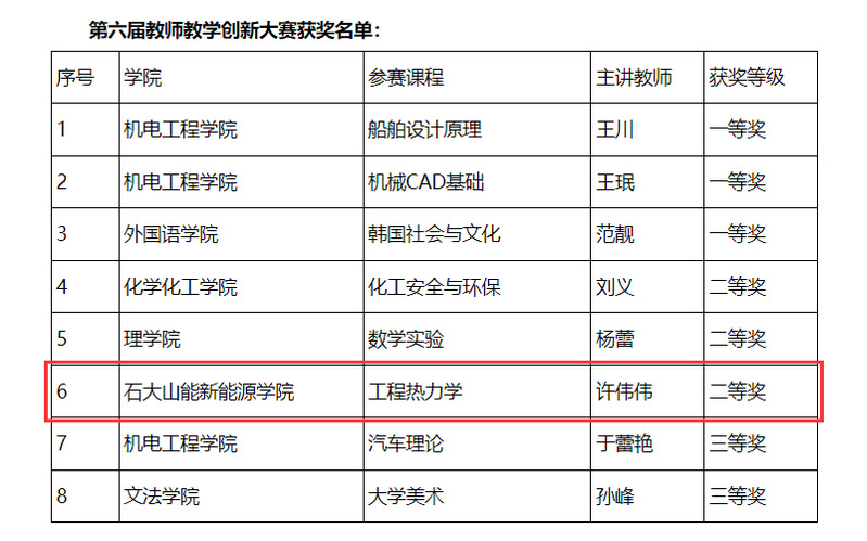 近日,学校第六届教师教学创新大赛圆满收官。经过激烈角逐,八项作品脱颖而出。其中,我院许伟伟老师凭借多年深耕教学的扎实积累,通过新颖的教学设计、鲜明的创新特色和扎实的育人成效,沉着应战、精彩展现,最终她主讲的《工程热力学》荣获大赛二等奖,为学院赢得了荣誉。