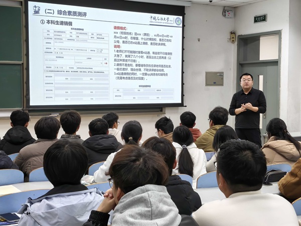 马尉博老师首先结合本研一体化培养的核心特点与实施要求,系统解析了绩点评定与综合测评的具体评价体系,着重强调了学术研究规范与学习过程管理在本研阶段的重要性。他现场分步演示了数字石大平台的各项操作流程,清晰讲解了平台使用中的重点与注意事项,并针对班级日常管理的优化完善,提出了建立精细化制度考核表的具体建议。此外,他还立足校园生活实际,从宿舍安全隐患排查、卫生纪律保持标准及其他学生管理规定等方面,向同学们进行了细致全面的说明。王嘉老师则着重强调了班级凝聚力的培育对于集体发展和个人成长的重要意义,并就即将到来的期末考试备考,向同学们提出要端正学习态度、注重复习实效的核心建议。张子良老师在班会中指出,本研班的学习平台对同学们而言既是难得的机遇,更是需要扛起的责任,同学们需始终保持清醒的自我认知,在扎实提升学业成绩的同时,更要全面打磨思想品德、锤炼综合素养。三位辅导员的指导内容详实具体、贴合班级实际,针对性极强,形成了从学业管理方法到人格培养方向的完整指引体系。