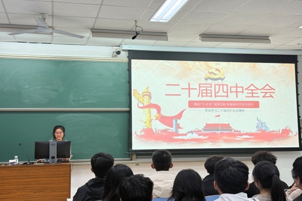 活动伊始,李文燕向同学们强调了党的二十届四中全会的重要地位和深远影响。她指出,党的二十届四中全会为未来我国经济社会发展擘画了宏伟蓝图,对实现中华民族伟大复兴的中国梦具有重大指导意义,作为新时代的青年学生,应当积极关注国家大事,深入学习全会精神,将个人成长与国家发展紧密结合。随后,李文燕详细讲解了全会的核心要点。从“十四五” 时期我国取得的重大成就回顾,到 “十五五” 时期经济社会发展的指导思想、重大原则、主要目标的阐释,再到战略任务和重大举措的解读,内容丰富、条理清晰,配以生动形象的图表和案例,让团支部成员对全会精神有了更为直观和深入的理解。