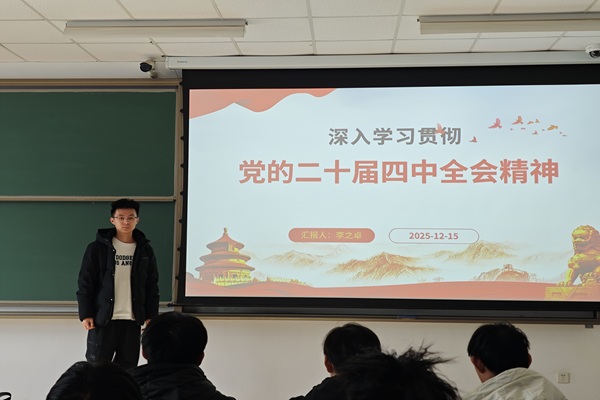 随后,李之卓系统介绍了党的二十届四中全会召开的背景、议程及其重大意义,重点解读了全会围绕中国式现代化、全面深化改革等作出的战略部署。讲解结束后,全体支部成员集中观看了全会相关新闻报道与解读视频。在学习交流环节,多位支部成员结合专业实际分享了心得体会。支部成员贺璇表示:“作为新能源领域的青年学子,我们要敏锐把握‘新质生产力’的发展要求,努力在能源清洁化、智能化领域中贡献智慧与力量。”