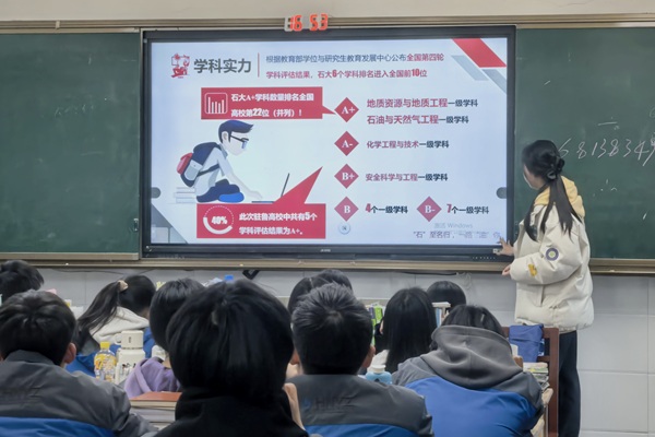 活动伊始,贺璇通过播放石大宣传片,向在场的高三学生们展示了学校的校园环境、学科特色、师资力量以及丰富多彩的校园文化生活,让学生们对石大有了初步的认识。随后,她结合自身的学习经历和在校感悟,详细介绍了学校的优势专业,特别是新能源科学与工程、石油工程等与国家能源战略紧密相关的特色学科,深入解读了各专业的培养目标、课程设置以及未来的就业前景和发展方向,帮助学生们了解不同专业的特点和优势,为他们后续的专业选择提供了有价值的参考。在分享志愿填报经验环节,贺璇重点讲解了如何根据自身兴趣、学科优势以及未来职业规划来选择专业和院校,并提醒学生们要密切关注招生政策的变化,合理规避志愿填报中的常见风险。