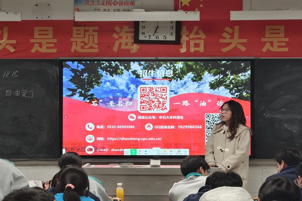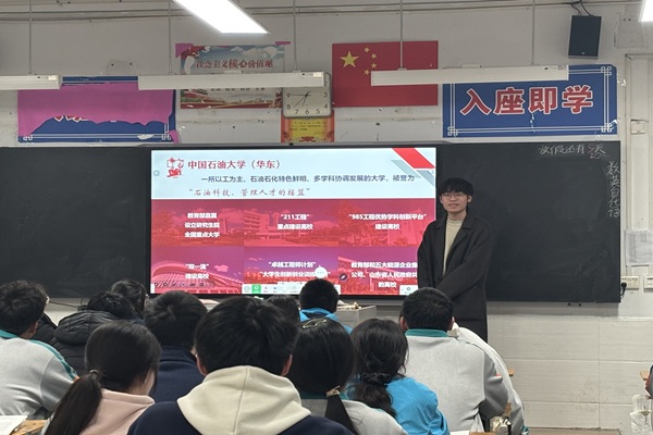 活动伊始,宣讲人以“初识石大”为切入点,通过航拍画面与风景展示,介绍学校依山傍水的地理位置与优美的校园环境,并详细讲解学校的办学历史、学科布局与科研平台。随后,宣讲团从“求学石大”“卓越未来”“多彩生活”三个维度,全方位解读学校的优势学科实力与育人特色,重点介绍电气工程及其自动化等优势专业的培养目标与就业前景,展示丰富的社团活动、科创竞赛与实践资源,并详细解读学校“三三三”本科培养体系、宽松的转专业政策、高就业率与高推免比例等核心优势,让学生们对大学生活有更为立体的认知。宣讲团还结合当前全球能源格局深刻调整、地缘政治博弈加剧的背景,围绕能源安全与绿色转型这一国家战略核心,讲解学校如何立足国家重大需求,聚焦油气勘探开发、能源储运等关键领域,为国家能源自主可控提供技术与人才支撑,让学子全面感知石大的战略地位与发展前景。