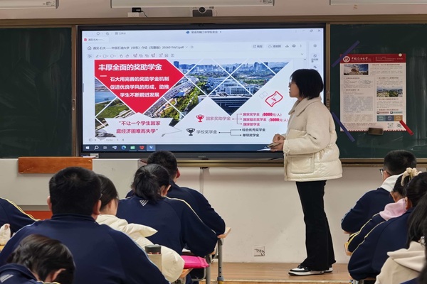 宣讲活动以学校宣传视频拉开序幕,向在场学生展示了石大“家国同心、艰苦奋斗、惟真惟实、追求卓越”的精神内涵。随后,宋师阅依托学校招生宣传PPT,从办学历史、学科布局、人才培养等方面介绍了学校整体情况。许佳禾则结合自身专业背景,重点讲解了学校在智能感知工程等领域的学科优势,并通过展示实验室图片,介绍了学校在无人化钻井、智能油田等前沿方向的研究进展,体现了智能感知技术与传统石油工业的融合趋势。她还分享了校园生活设施与学生活动开展情况,包括餐饮、住宿条件及社团文化等方面,帮助在场学生更全面地了解大学环境。在互动答疑环节,两位队员围绕高三学生普遍关心的录取分数、专业选择、转专业政策、就业前景等问题,结合自身经验进行了解答。