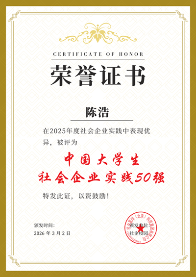 陈浩获评社企校园C50荣誉证书