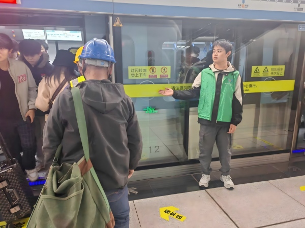 本次活动以青年之家成员带队、面向全院公开招募志愿者的形式开展,学院各年级志愿者积极响应、踊跃报名,最终选拔出余名志愿者参与其中,以实际行动践行青年担当,为市民日常出行保驾护航。活动前期,社志中心认真筹备、周密部署,不仅完成了志愿者筛选、志愿马甲与服务手册准备等工作,还组织全体志愿者开展岗前培训,详细讲解地铁服务礼仪、客流疏导技巧,明确各岗位服务职责、具体分工及乘车安全注意事项,培训后统一带队前往王家港站,与站点工作人员完成细致对接,细化岗位分配与工作衔接流程,确保志愿服务专业规范、高效推进。服务期间,志愿者们身着绿马甲,坚守在各自的岗位上认真履职。在站厅引导区、闸机通行区、站台候车区等关键区域,主动引导乘客有序进出站、文明候车乘车,及时提醒乘客注意脚下安全、保管好个人物品;面对乘客关于线路换乘、站点信息、票务办理等各类咨询,志愿者耐心倾听、清晰解答、细致指引,还专门协助老年乘客、外地游客操作自助售票机、申领地铁乘车码;遇到携带大件行李、行动不便的乘客,志愿者第一时间上前帮扶,全程护送其顺利进出站、登上列车。志愿者们以认真严谨的态度、热情暖心的服务,全力维护站内通行秩序,用坚守与奉献传递志愿温度,赢得了站点工作人员和过往市民的一致好评