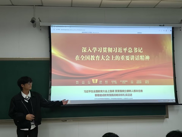 活动伊始,胡明振围绕全国教育大会精神展开专题讲解,从教育的根本任务、教育强国建设的核心内涵出发,结合高校人才培养要求与新能源专业学习特点,深入分析全国教育大会精神对青年学生的成长指引与要求,系统解读新时代青年在教育发展与国家建设中肩负的责任与使命,为同学们梳理学习要点,帮助大家搭建对大会精神的整体认知框架。